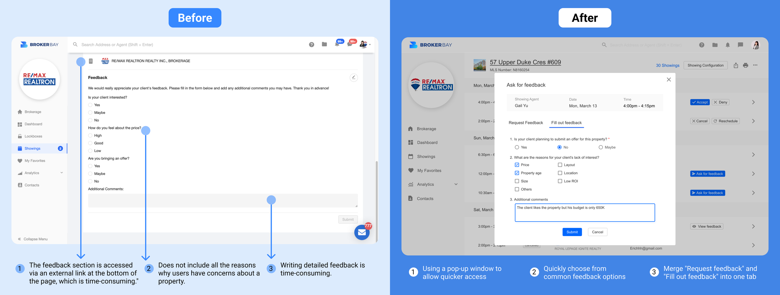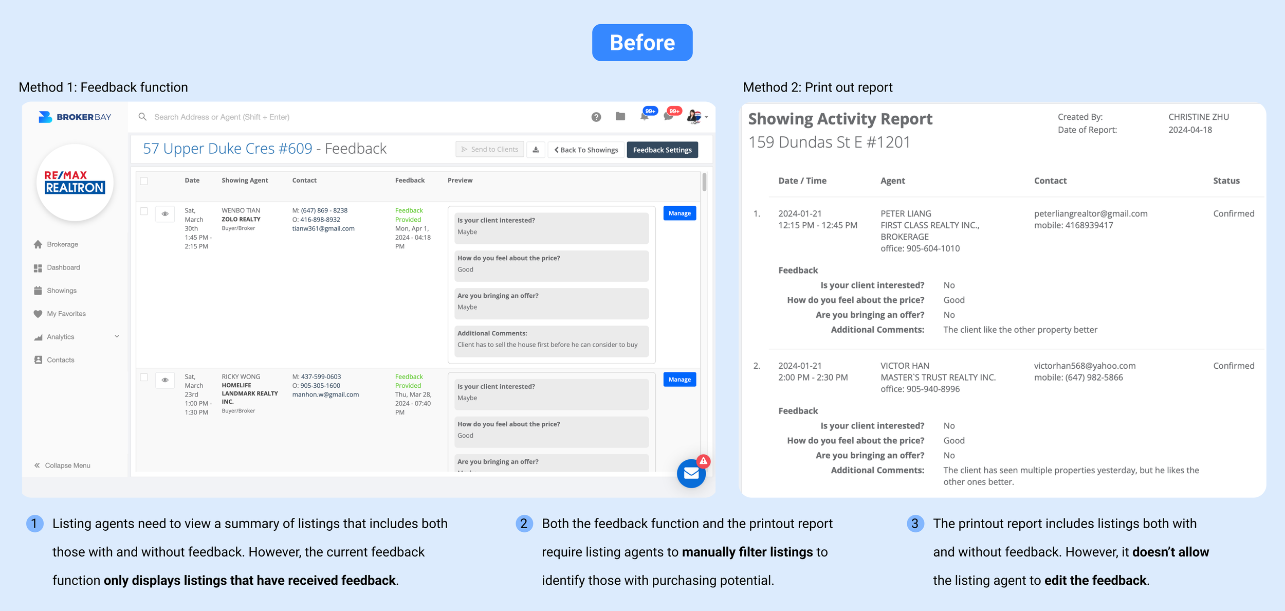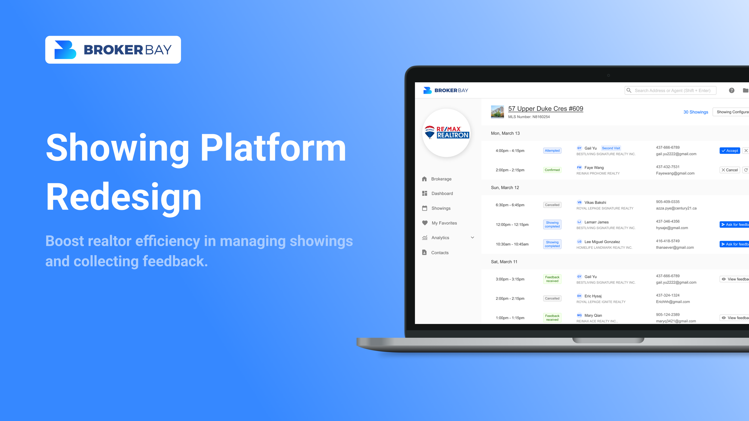 While working as an Administrative Assistant at Re/Max Realtron Brokerage, part of my duties involves helping listing agents manage showings and solicie feedback. I found that the current showing management system, Brokerbay, is not efficient enough, so I decided to redesign this product.