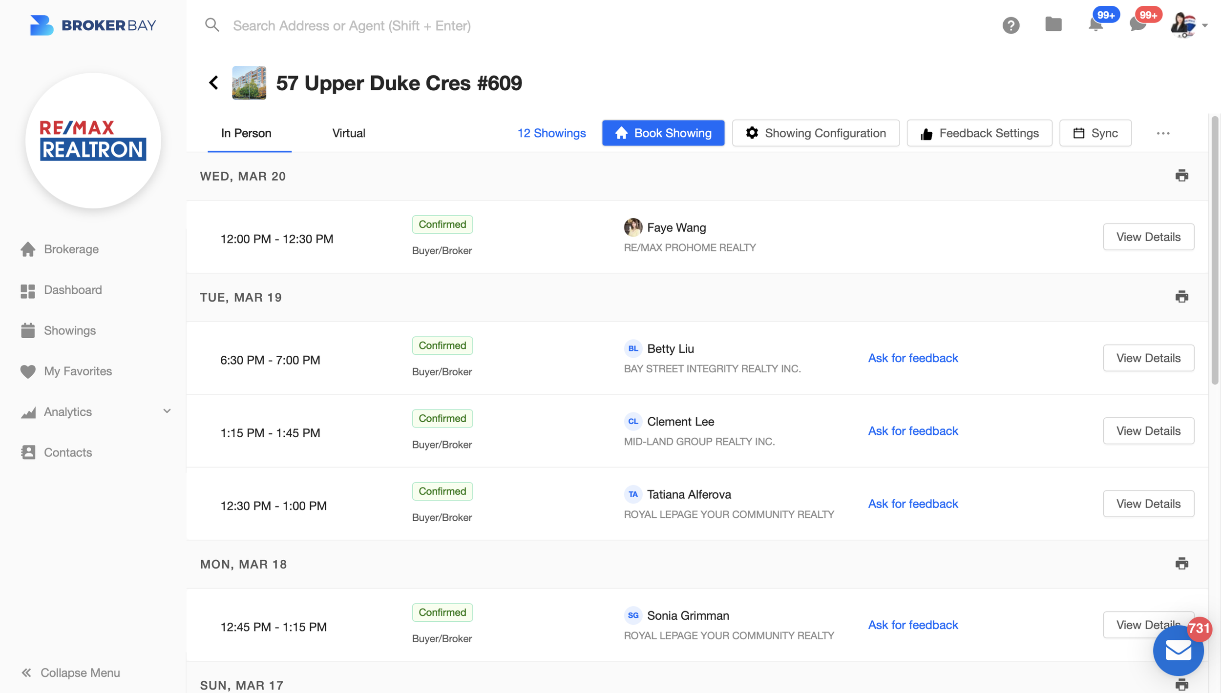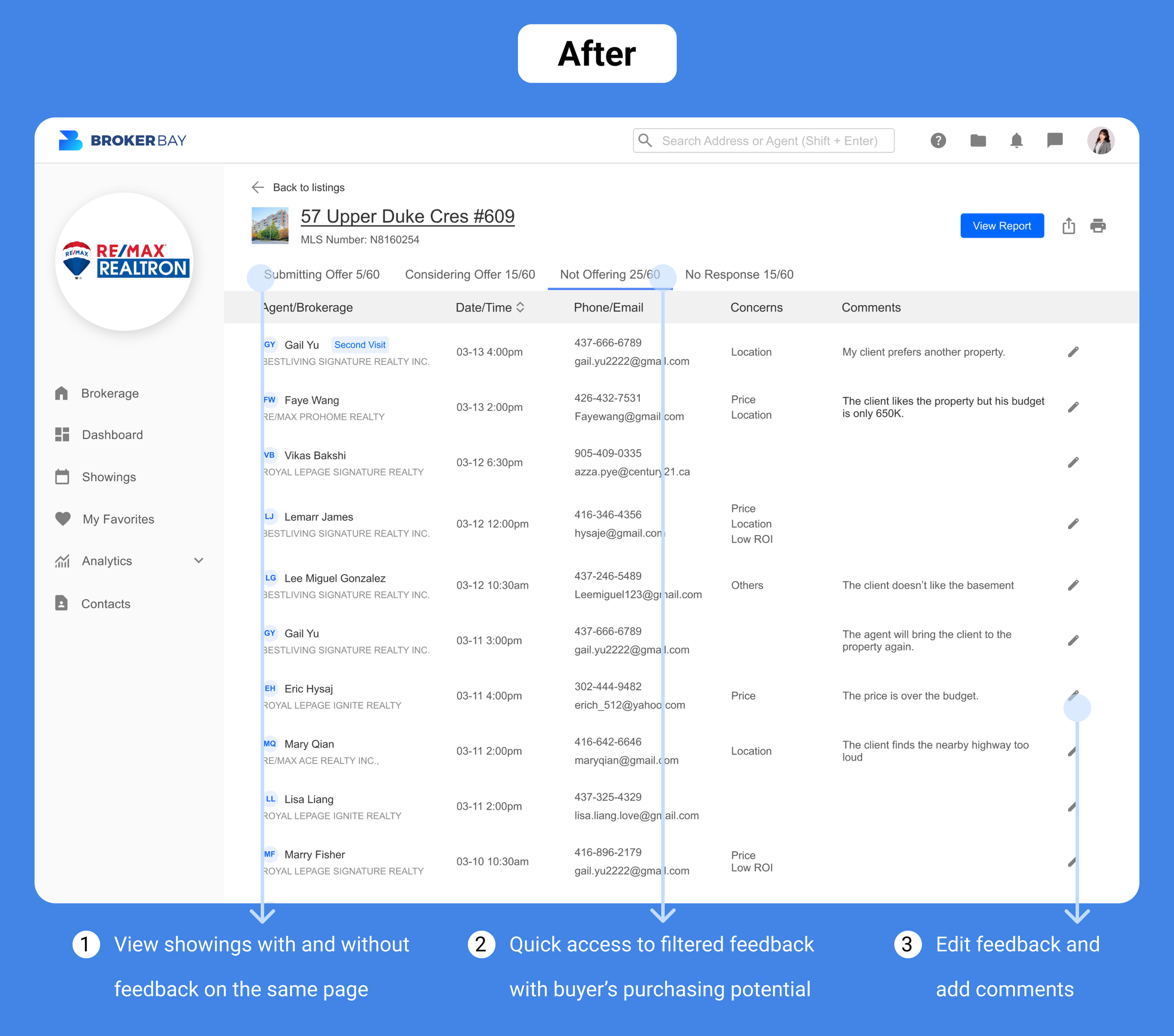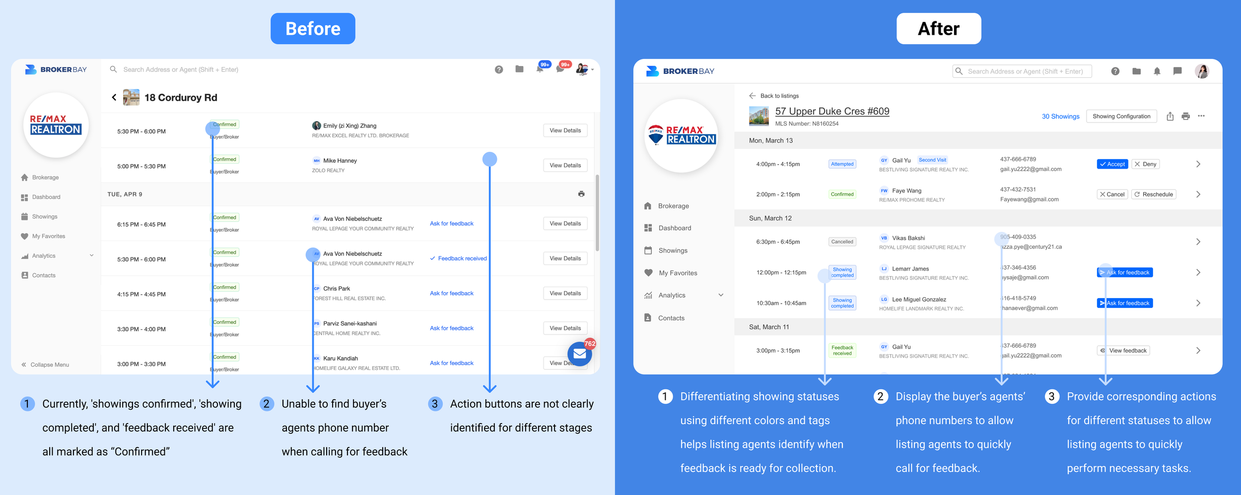 While working as an Administrative Assistant at Re/Max Realtron Brokerage, part of my duties involves helping listing agents manage showings and solicie feedback. I found that the current showing management system, Brokerbay, is not efficient enough, so I decided to redesign this product.