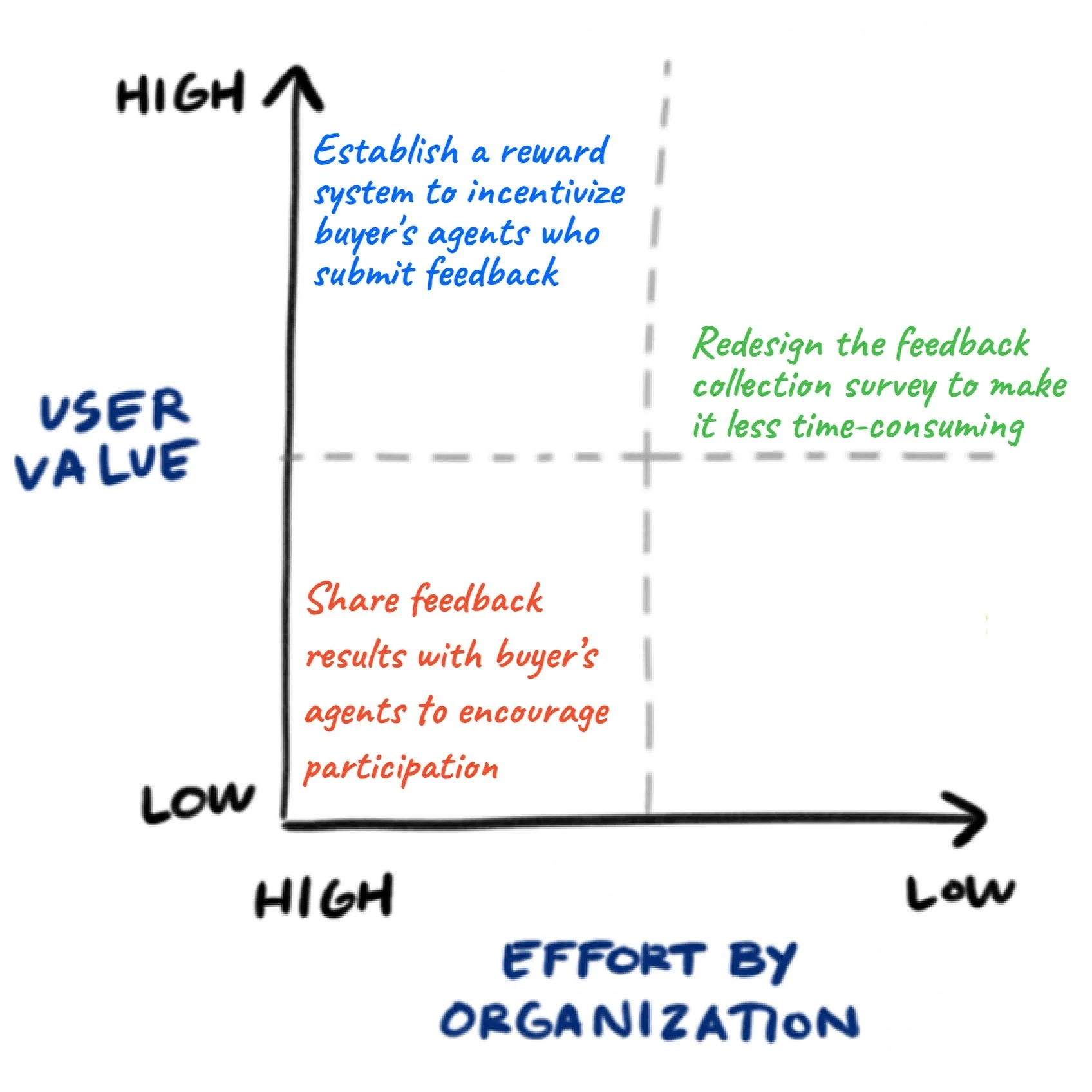 To increase the likelihood that buyer’s agents will fill out feedback, I proposed 3 possible solutions and used an impact-effort matrix to prioritize them.
