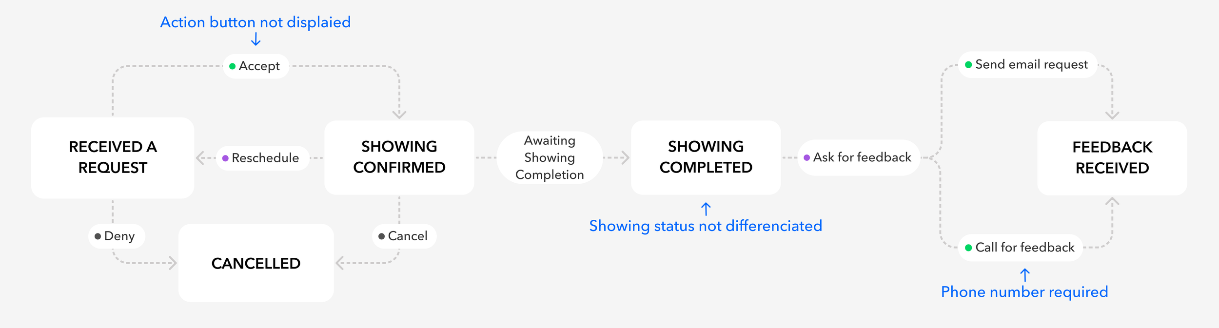 Currently, 'showings confirmed', 'showing completed', and 'feedback received' are all marked as “Confirmed.” These should be differentiated to help listing agents know when it is appropriate to ask for feedback.