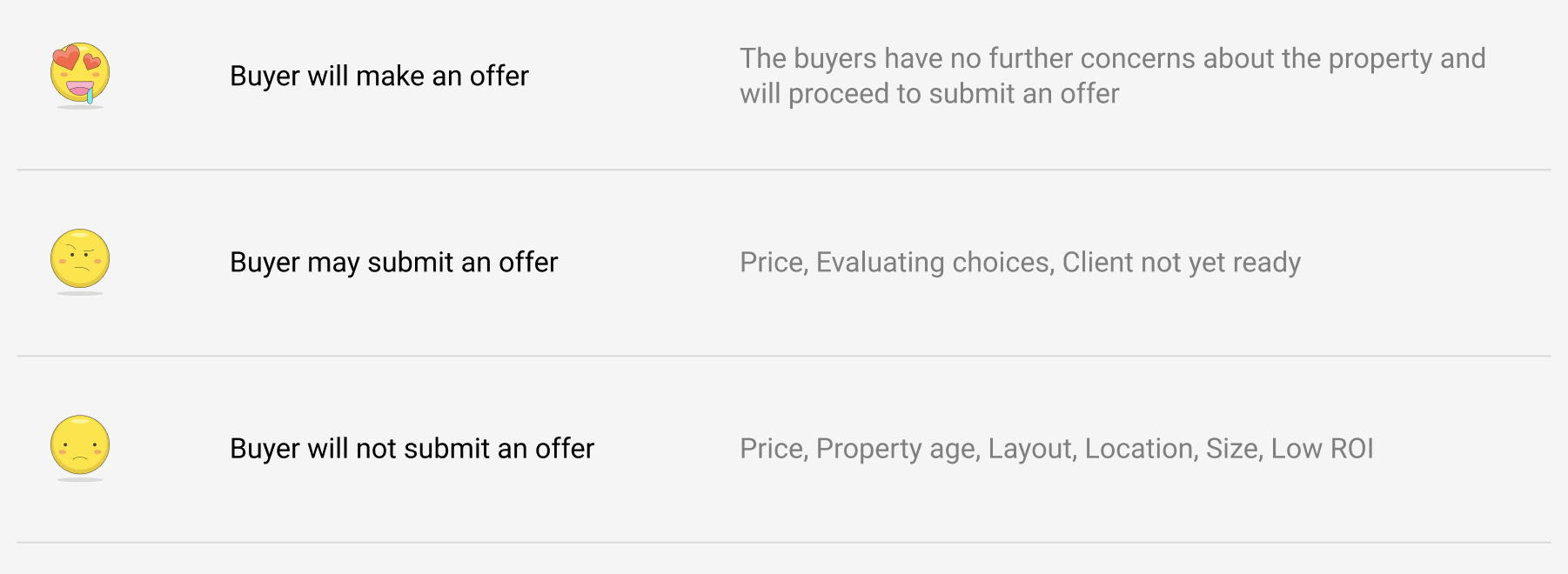 By discussing common feedback with listing agents, I identified three types of feedback: 'will bring offer,' 'might bring offer,' and 'will not bring offer.' Each category includes commonly defined reasons that cover 80% of the cases.
