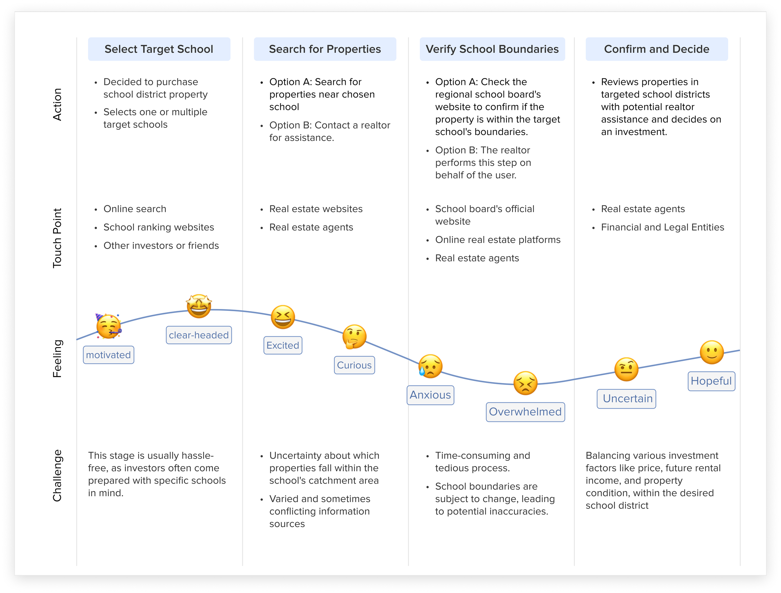 Drawing from the insights obtained during user interviews, I chose to employ a user journey map to highlight the existing pathways and obstacles users encounter when purchasing properties within their desired school zones.