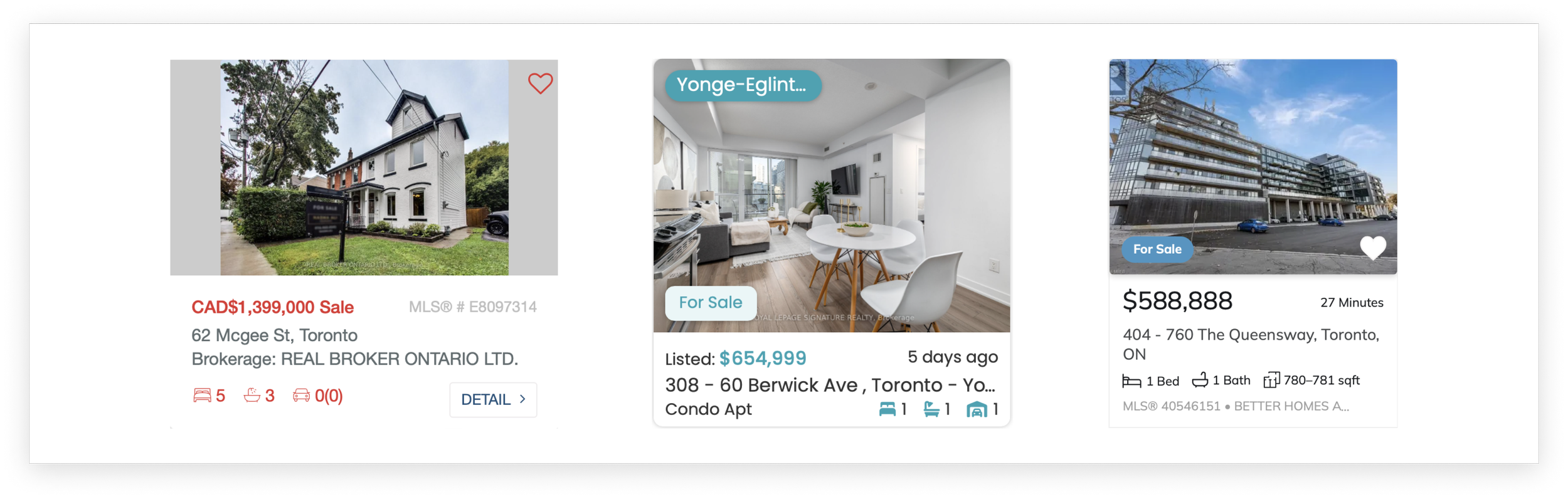 The listing cards on these standard real estate brokerage websites display only basic information about the property and fail to indicate the school district to which the property belongs.